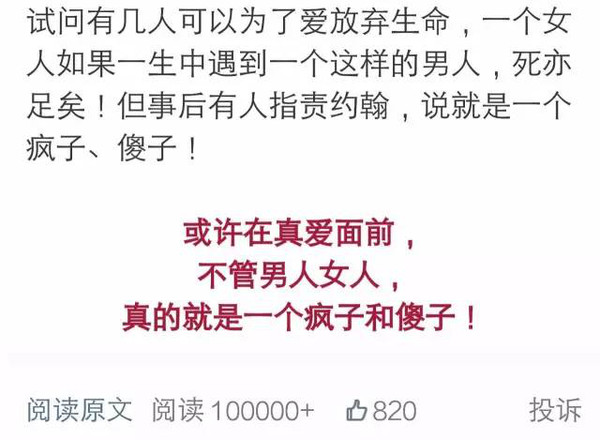 好(hǎo)了(le),就(jiù)是(shì)這(z∑ γhè)樣一(yī)篇“歌(gē)頌真愛(•§↑☆ài)”的(de)文(wén)章(zhāng),借著(zhe)眼下(x"★∞♠ià)熱(rè)點事(shì)件(jià©÷₹n)在網絡風(fēng)生(shēng)水(shuǐ)起,不(bù)知(z™&αhī)讓多(duō)少(shǎo)癡男(nán)怨女(nǚ)感歎“我≈<×又(yòu)相(xiàng)信愛(ài)情γ♦★∞了(le)”,相(xiàng)關文(wén)章(zhāng)點擊更是(s→☆hì)閱讀(dú)量破10W+。(下(xià)圖所示)